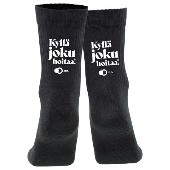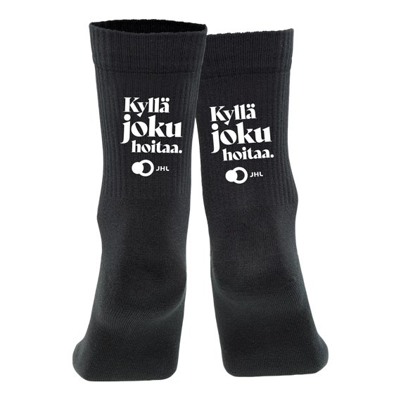 Hinta sisältää Kyllä joku hoitaa -logomerkkauksen sukkien taakse sekä perusetiketin.